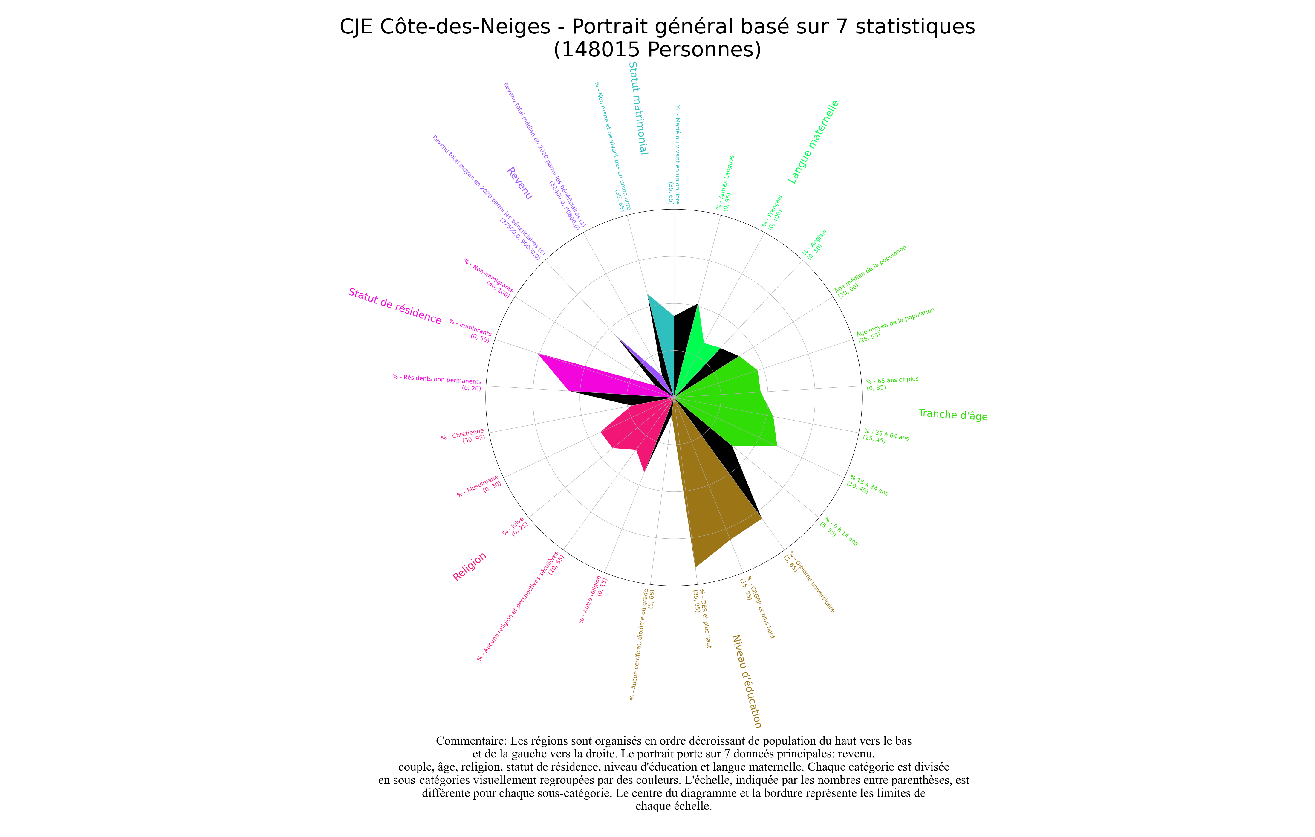 Ce document visuel illustre un portrait global de la population de Côte-des-Neiges (148 015 personnes) à partir de sept dimensions statistiques. Chaque couleur représente une catégorie de variables subdivisée en sous-indicateurs. Le commentaire en bas du graphique précise que les régions sont organisées selon leur taille de population et que chaque sous-catégorie possède sa propre échelle de pourcentage. Le but est de fournir une vue d’ensemble intuitive des caractéristiques sociales et démographiques du quartier.