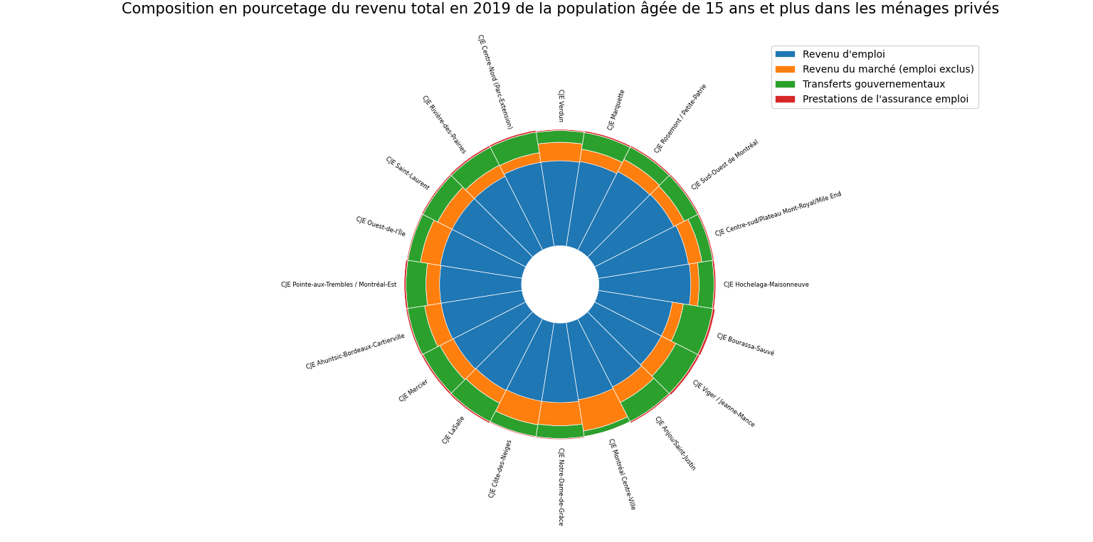 Le document visualise la composition du revenu total pour plusieurs territoires locaux en 2019. Chaque territoire apparaît comme un segment d’un anneau circulaire, et chaque segment est lui-même subdivisé par couleur selon les catégories de revenu. Le rendu donne une “rosace économique”, où l’œil peut comparer d’un coup d’un seul la structure financière des populations locales.