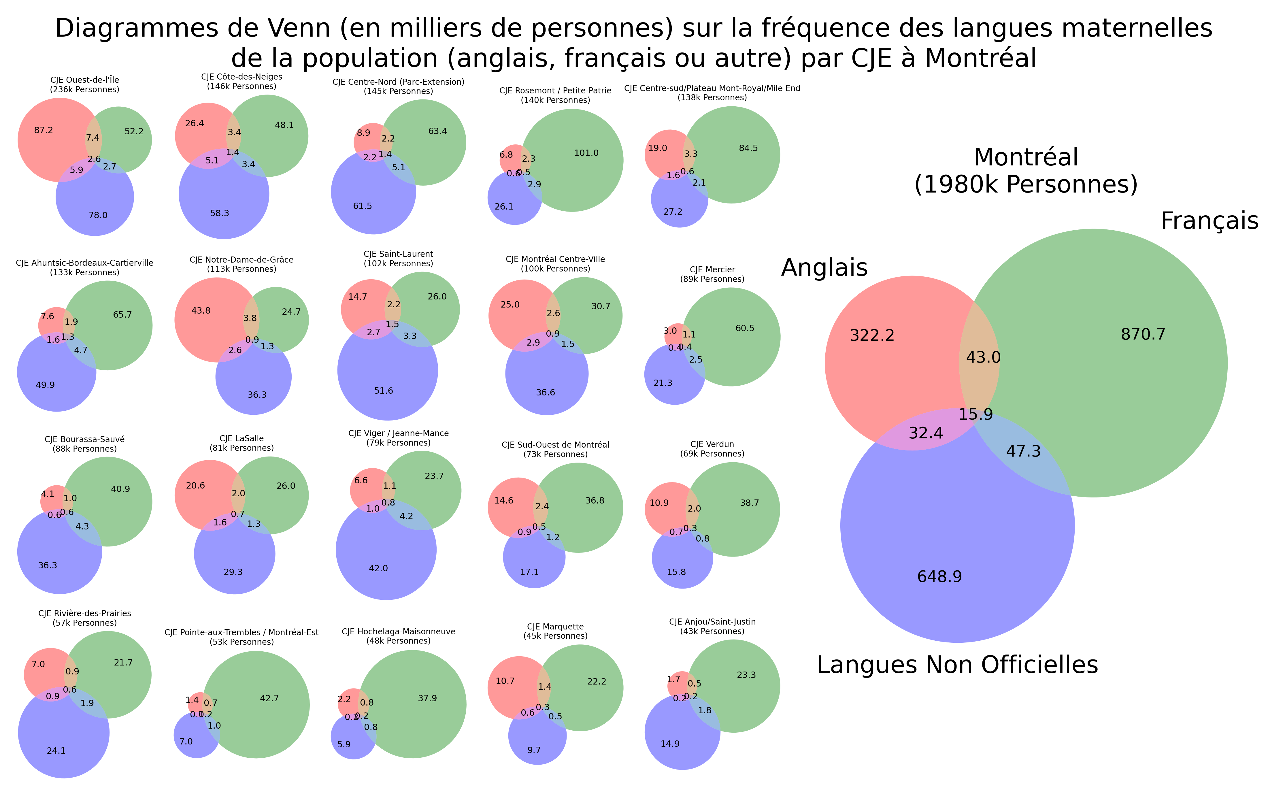 Le document présente une constellation de petits diagrammes de Venn où chaque CJE de Montréal est représenté par trois cercles colorés correspondant aux trois grandes catégories linguistiques. Les tailles des cercles reflètent les effectifs (en milliers de personnes). Cela crée une mosaïque visuelle qui permet de comparer immédiatement la composition linguistique des quartiers et de repérer où l’anglais, le français ou les langues non officielles dominent. Un grand diagramme placé à droite présente la composition globale de Montréal, servant de référence comparative
