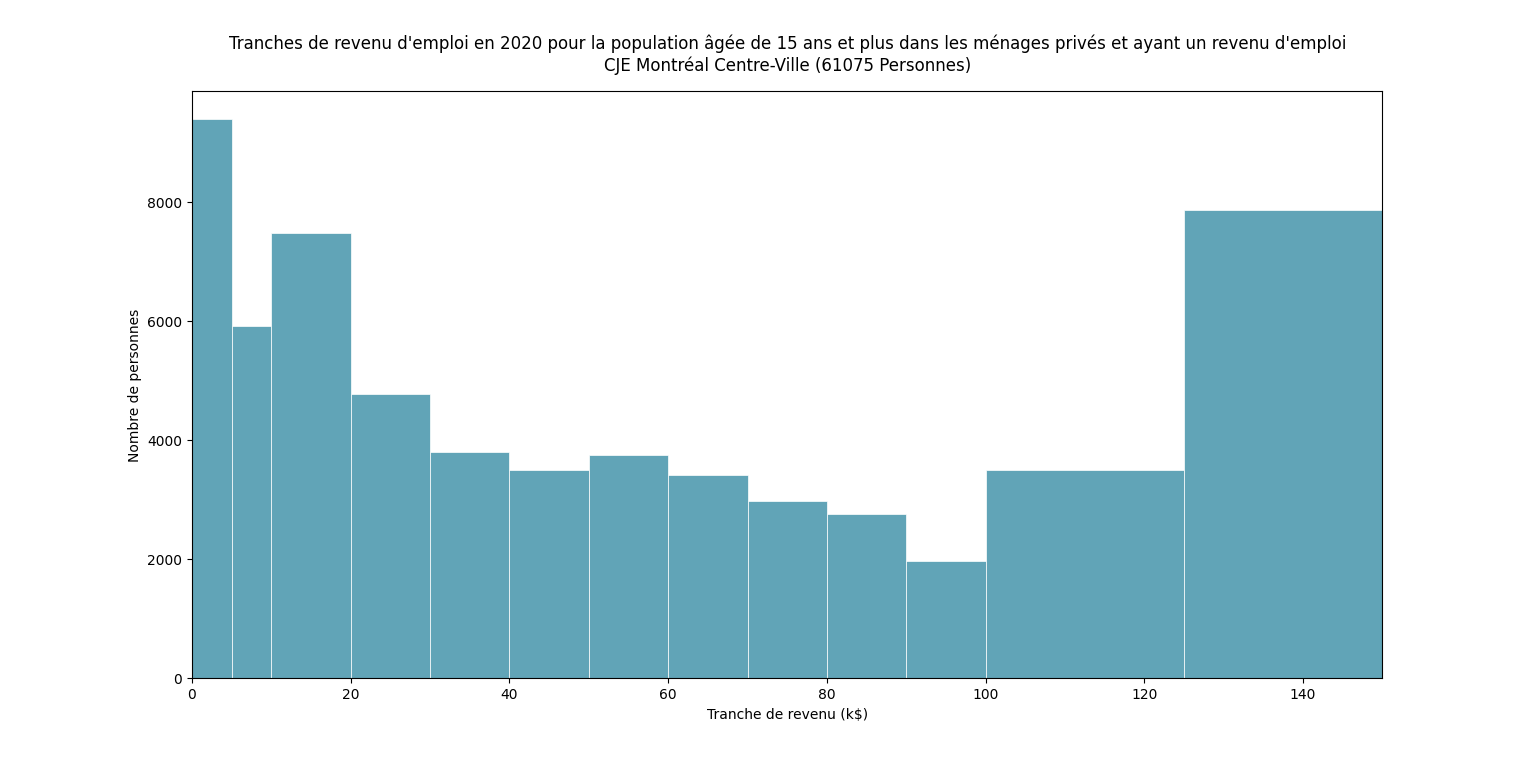 L’histogramme montre la répartition des revenus d’emploi dans le secteur du CJE Montréal Centre-Ville en 2020. Les tranches les plus basses (0–20 k$) rassemblent les effectifs les plus élevés, puis la distribution s’étire progressivement vers des tranches plus élevées, avec un regain visible dans les tranches de revenus très élevés (120–150 k$).