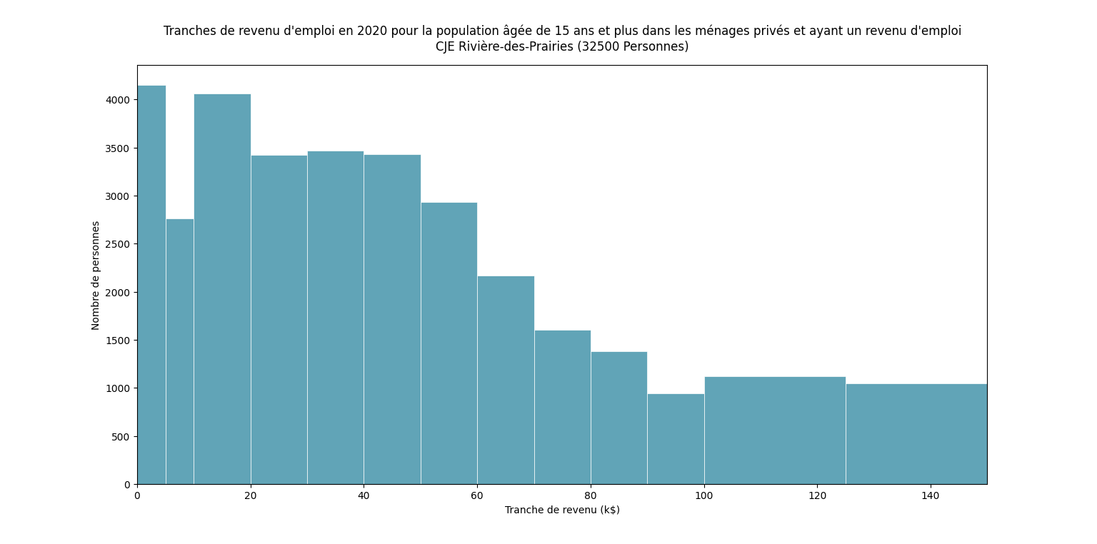 Répartition des personnes de 15 ans et plus selon leur tranche de revenu d’emploi en 2020 à Rivière-des-Prairies. Chaque barre indique le nombre de résidents dans la tranche correspondante parmi environ 32 500 personnes.
