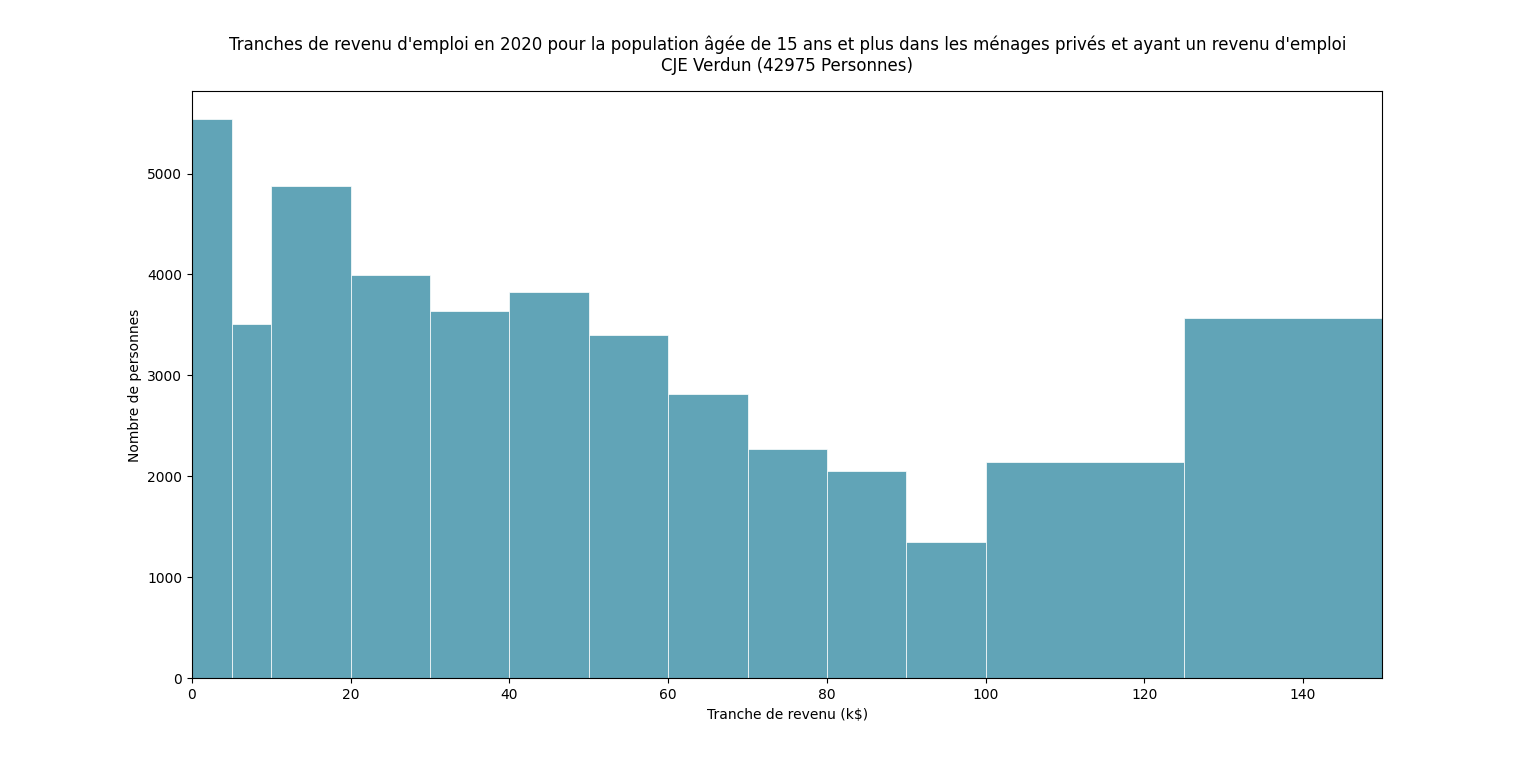 Le graphique présente un histogramme illustrant le nombre de personnes de 15 ans et plus ayant un revenu d’emploi, réparties selon des tranches exprimées en milliers de dollars (k$). Les barres montrent une forte densité dans les tranches plus basses (sous 20–25 k$), suivie d’une décroissance progressive à mesure que le revenu augmente. On observe aussi quelques plateaux et reprises dans les tranches élevées, suggérant une diversification des profils socio-économiques. Les axes indiquent respectivement les tranches de revenu (horizontal) et le nombre de personnes (vertical). Près de 43 000 habitants sont représentés dans cet ensemble.