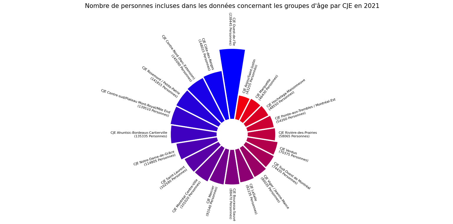 Le graphique représente un anneau découpé en autant de segments qu’il y a de CJE. Chaque secteur est étiqueté avec le nom du CJE et le nombre total de personnes représentées pour 2021. Les valeurs varient fortement selon le territoire, ce qui met en évidence la diversité démographique et l’inégale affluence des CJE. Les couleurs, qui évoluent dans un gradient violet-rouge-bleu, servent à distinguer visuellement les entités sans introduire d’interprétation thématique particulière. L’ensemble offre une vue d’ensemble compacte mais riche, utile pour repérer rapidement les CJE les plus fréquentés