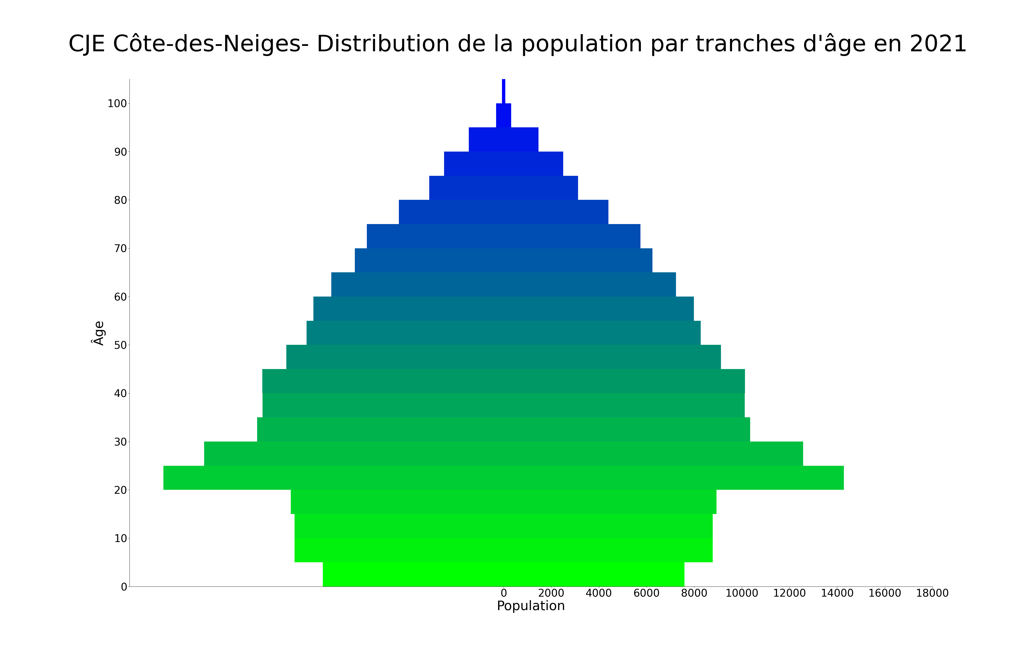 L’image représente une distribution de la population selon des tranches d’âge allant de 0 à 100 ans pour le CJE Côte-des-Neiges en 2021. Le graphique adopte la forme d’une pyramide d’âge stylisée : les barres horizontales s’allongent différemment en fonction de la taille de cohortes successives.