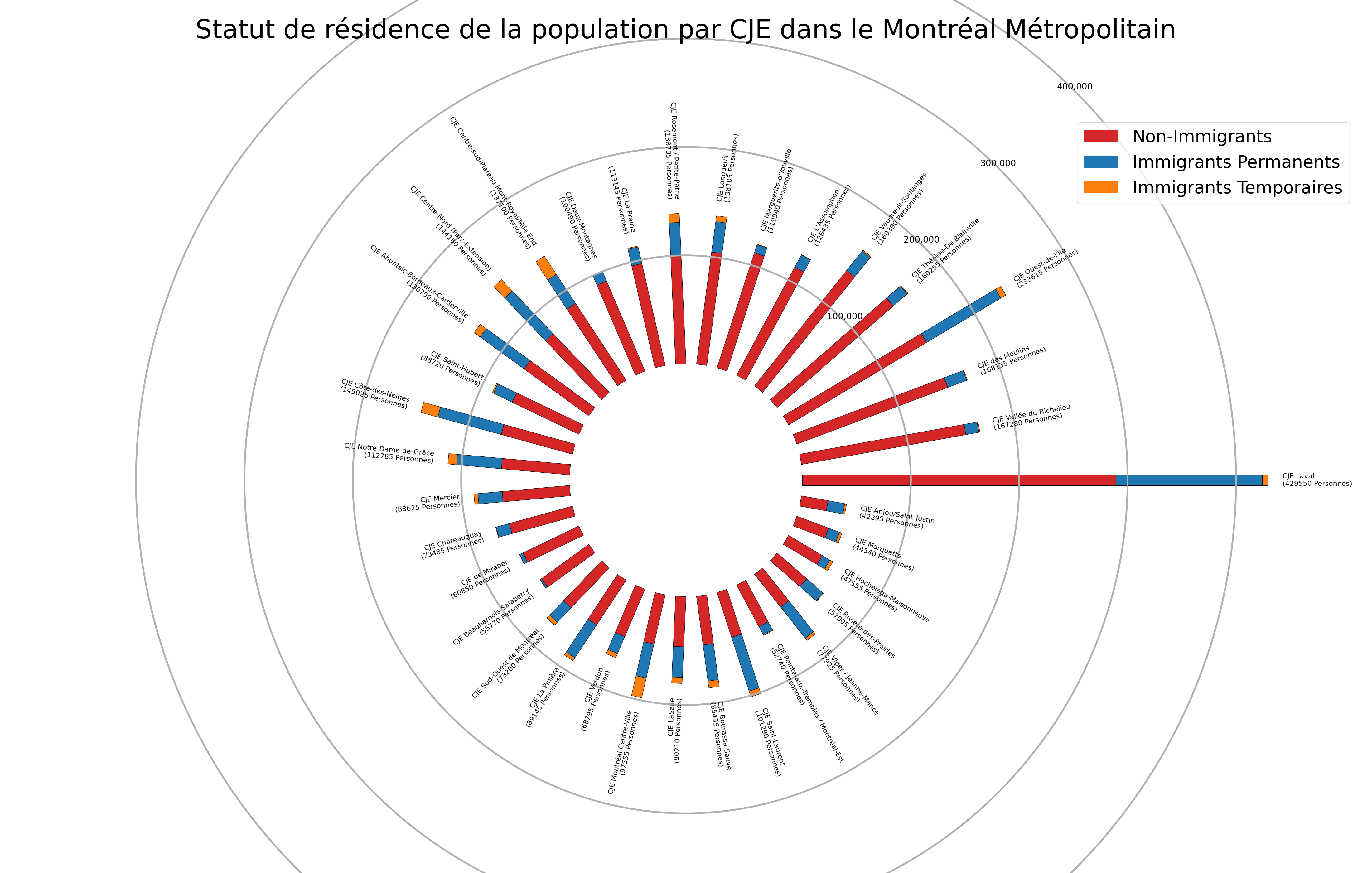 L’image illustre, sous forme d’un diagramme radial, la répartition de la population par statut migratoire pour chaque CJE du Montréal métropolitain. Chaque barre représente le total d’habitants d’un territoire, découpé en trois segments (non-immigrants, immigrants permanents, immigrants temporaires).