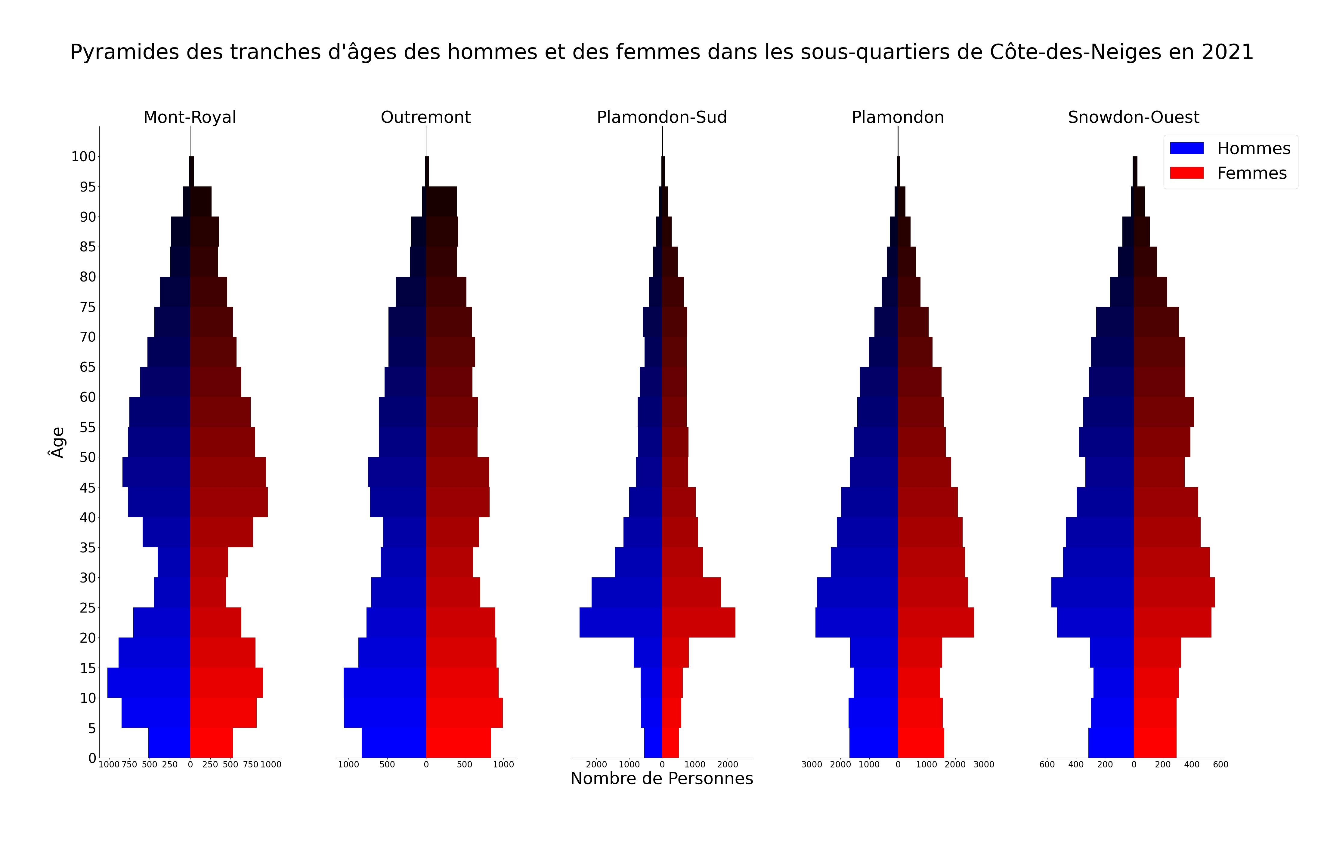 Graphique composé de cinq pyramides des âges (Mont-Royal, Outremont, Plamondon-Sud, Plamondon, Snowdon-Ouest), chacune représentant la distribution d’hommes (en bleu) et de femmes (en rouge) par tranches d’âge, dans les sous-quartiers de Côte-des-Neiges.