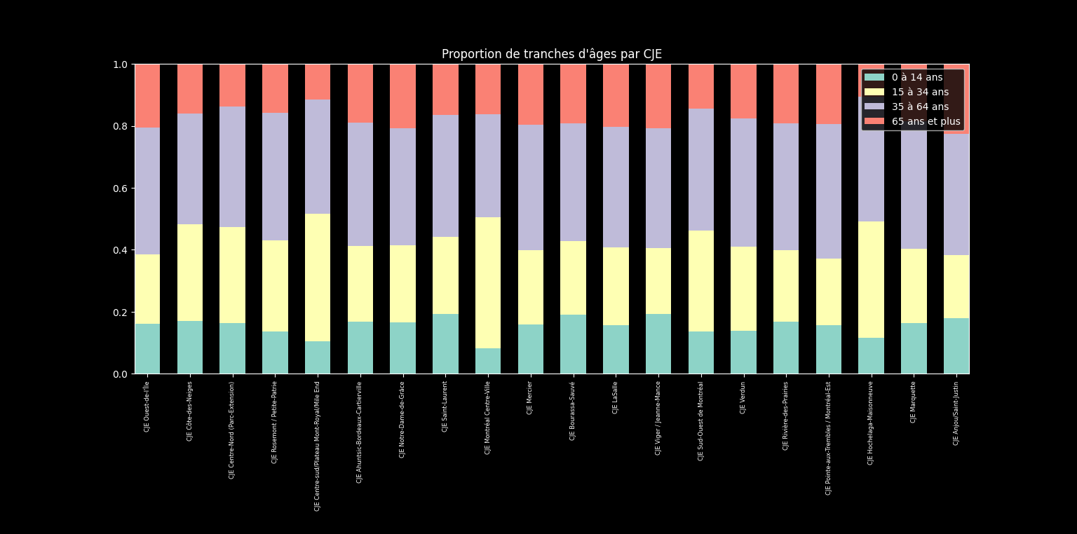 Chaque barre empilée représente un territoire de CJE. Les couleurs indiquent la proportion des groupes d’âge suivants : 0 à 14 ans, 15 à 34 ans, 35 à 64 ans, et 65 ans et plus