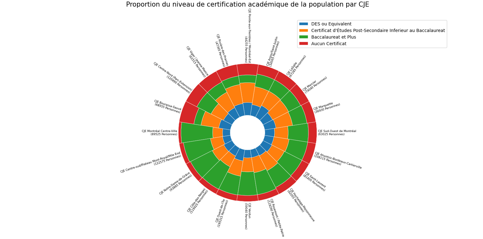 Le document présente un diagramme circulaire radial composé de plusieurs anneaux, chacun correspondant à un territoire de CJE à Montréal. Les segments colorés illustrent la proportion des différents niveaux de certification académique au sein de la population. Les territoires centraux affichent généralement une proportion plus élevée de personnes détenant un baccalauréat ou un diplôme supérieur, tandis que certains secteurs périphériques présentent une part plus importante de personnes sans certification ou avec un diplôme de niveau secondaire. Cette visualisation facilite la comparaison rapide des profils éducatifs et met en lumière les disparités territoriales en matière de scolarité, constituant un outil pertinent pour orienter les interventions en formation, en insertion professionnelle et en accompagnement des jeunes.