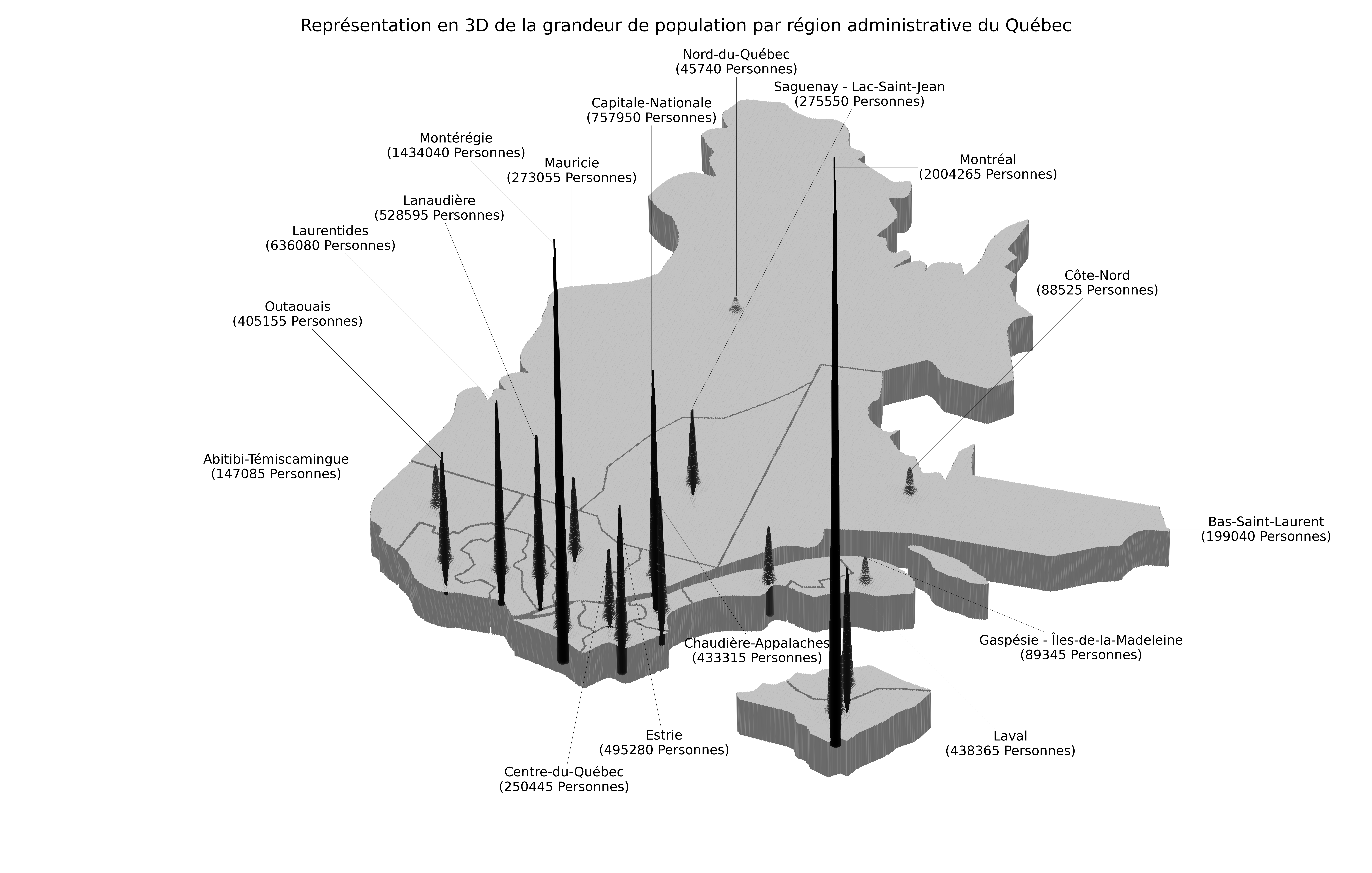 Le document présente une carte tridimensionnelle du Québec dans laquelle chaque région administrative est représentée par une surface extrudée. Un pic vertical est positionné au centre de chaque région, dont la hauteur correspond au nombre d’habitants. Les régions métropolitaines et densément peuplées, notamment Montréal, la Montérégie et la Capitale-Nationale, se distinguent par des pics nettement plus élevés, tandis que les régions nordiques et périphériques affichent des volumes plus modestes. Cette visualisation offre une lecture intuitive et immédiate des contrastes démographiques régionaux et constitue un outil efficace pour l’analyse territoriale, la planification des services et la communication des enjeux démographiques à l’échelle provinciale.