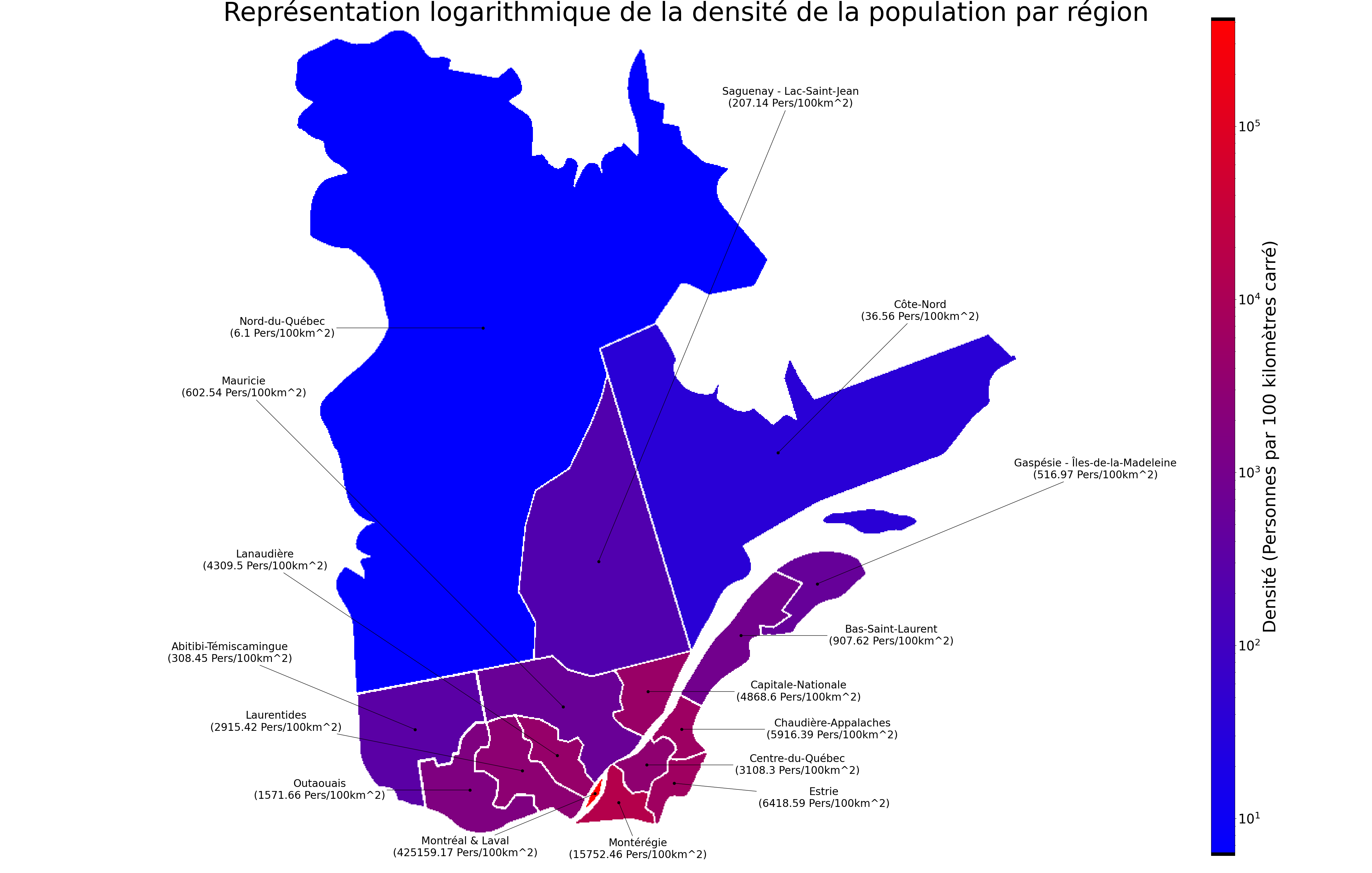 La couleur de chaque région indique sa densité de population (personnes par 100 km²) selon une échelle logarithmique. Les teintes froides représentent les régions faiblement peuplées, tandis que les teintes chaudes indiquent les régions à forte densité. Les étiquettes précisent la valeur exacte pour chaque région