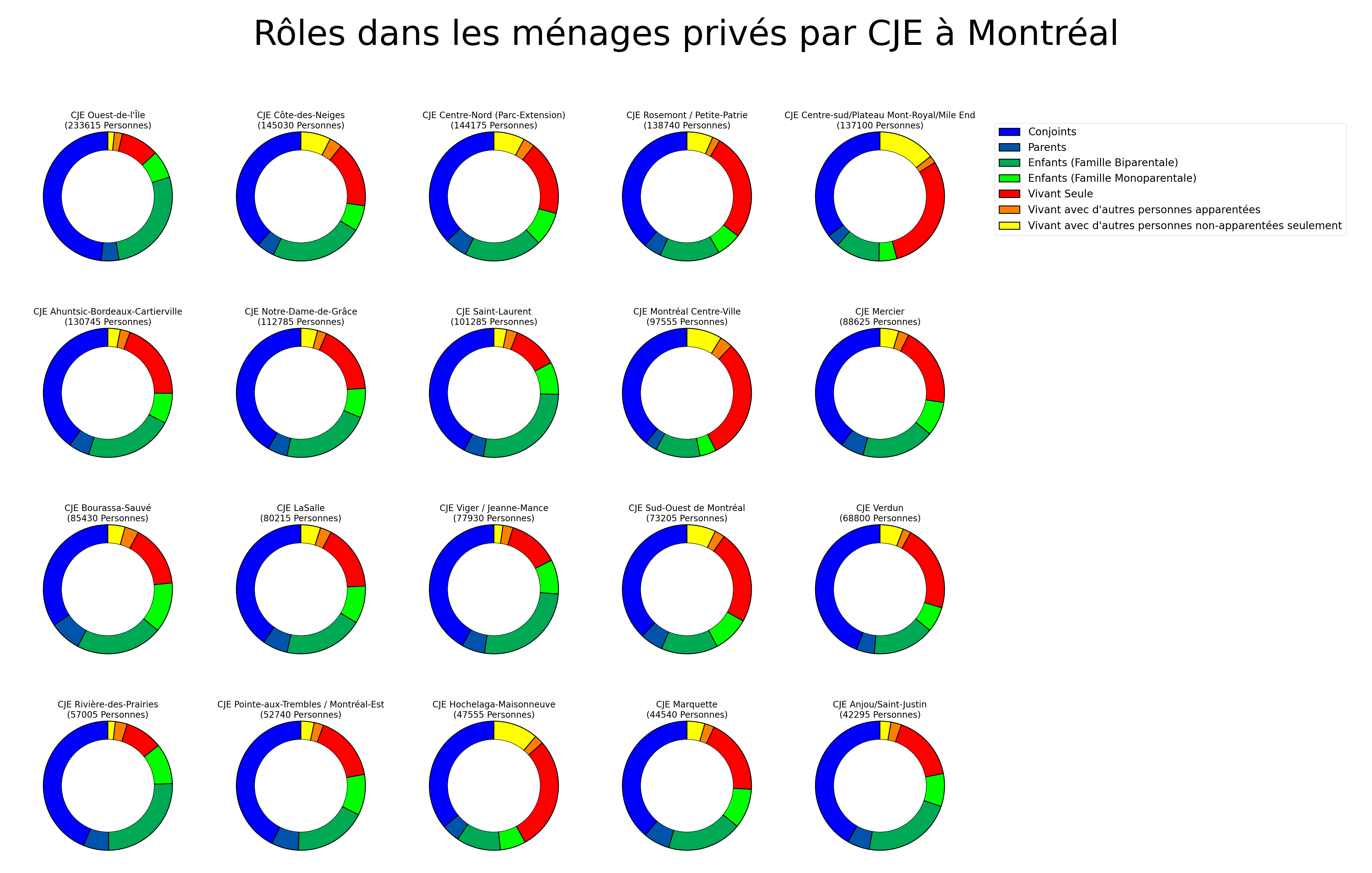 Le document présente une série de diagrammes circulaires de type « donut », chacun correspondant à un territoire de CJE à Montréal. Les segments illustrent la répartition des rôles occupés par les individus au sein des ménages privés. Les territoires centraux se distinguent généralement par une proportion plus élevée de personnes vivant seules ou dans des ménages non familiaux, tandis que les secteurs plus périphériques affichent une part plus importante d’enfants et de familles biparentales. Cette visualisation met en évidence les contrastes territoriaux dans les structures familiales et résidentielles et constitue un outil pertinent pour orienter les interventions en matière de services jeunesse, de soutien aux familles et de lutte contre l’isolement
